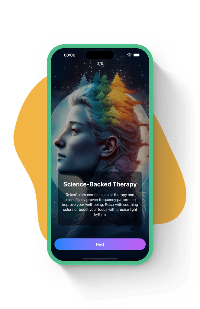 RelaxColors uses scientifically proven light patterns and frequencies to influence your mood and mental state. Gentle pulsations and color therapy create a calming or energizing effect, depending on your chosen mode.